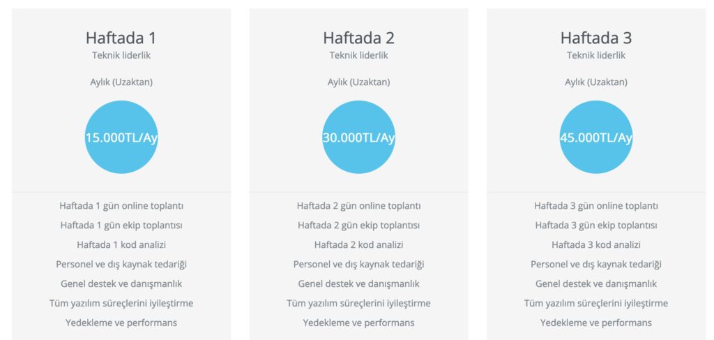 Daha anlatacak çok şey var ama çok da uzatmadan konuyu toparlamak gerekirse, ben projenin büyüklüğüne ve ayıracağım zamana göre aylık bir teknik liderlik fiyatı belirliyorum. Ekibin kurulması , proje planı, tasarım süreci ve teknik herhangi birşeye başlamadan önce benimle anlaşmanız gerekiyor bu yöntemi tercih ettiğinizde. Çalışmalara hemen başlıyoruz.